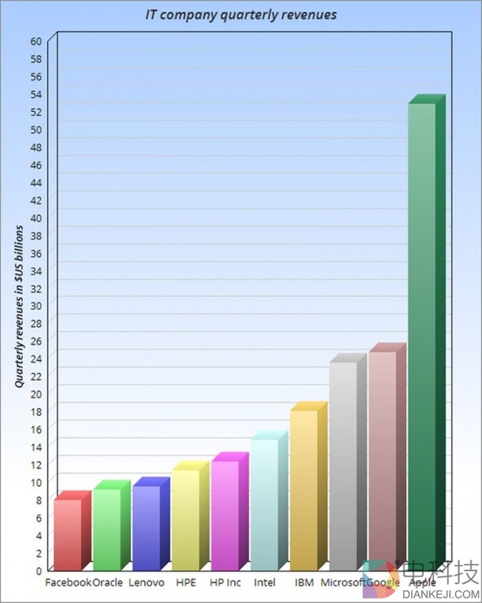 最近有媒体放出了一张各科技公司最新财季营收的对比柱状图,数据显示苹果的营收遥遥领先于其他公司。