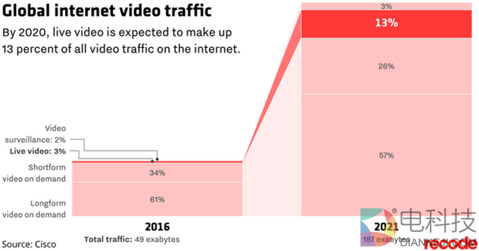 到2021年,视频直播产生的互联网流量预计将增长到近25艾字节(250亿千兆字节),占在线视频产生的互联网流量的大约13%。而在去年,视频直播产生的互联网流量约为1.6艾字节,占在线视频产生的互联网流量的约3%。