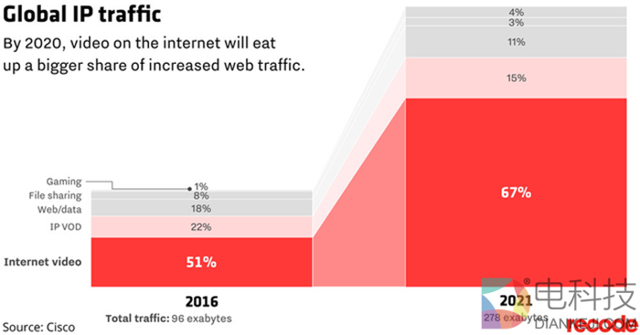 根据思科公司最近发布的预测报告,到2021年,在线视频所产生的互联网流量将占到互联网总流量的82%。而在2016年,在线视频所产生的流量在互联网总流量中的占比为73%。