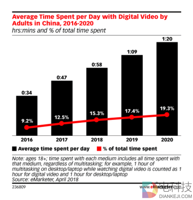 根据这份报告,今年中国成年人平均每天在移动设备上花费 2 小时 39 分钟,比 2017 年增长 11%。与此同时,看电视的时间将减少 2%,每天只有 2 小时 32 分钟。eMarketer 表示,数字视频服务的发展是这个变化的“关键驱动因素”。该公司预计,平均来看,中国成年人每天看在线视频的时间将同比增长 26%,达到 58 分钟。而到 2020 年,中国成年人将有 1/3 的上网时间用来看视频。