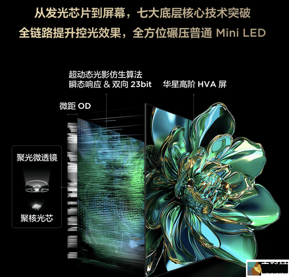 这是一整套系统级Mini LED控光方案,包含聚核光芯、聚光微透镜、微距OD、双向23bit、瞬态响应、超动态光影仿生算法以及华星高阶HVA屏等核心技术,万象分区的控光效果是普通分区的数倍,实现了控光精度和响应速度的跃升,带来远超单纯堆分区的真实画质表现。比如在观看银河、烟花、爆炸等复杂光影内容时,光影的层次分明、边界干净,没有传统背光电视常见的模糊和拖影,显示效果更加真实自然。