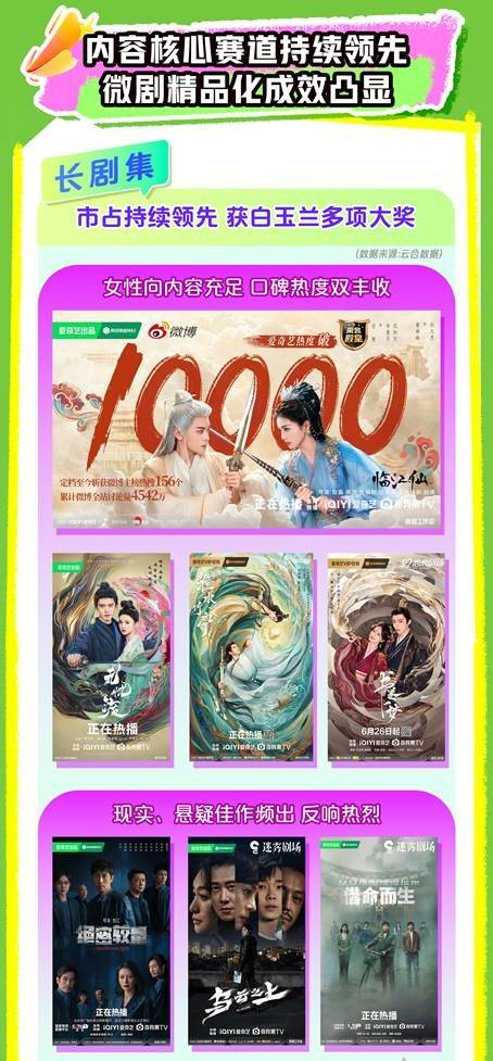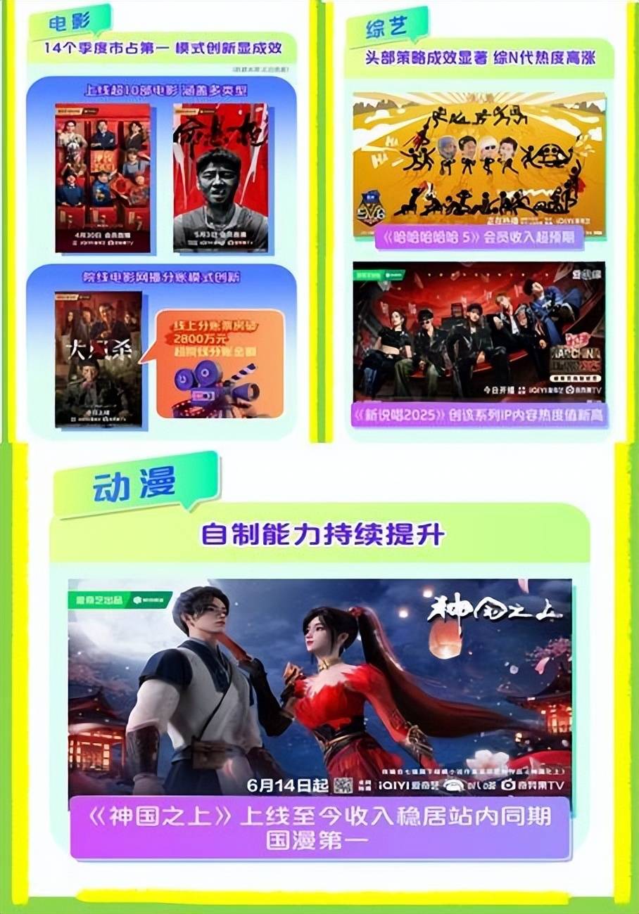 2025年第二季度,爱奇艺在核心长剧赛道继续保持领先,同时微剧、综艺、电影、动漫推出了多部高品质内容。