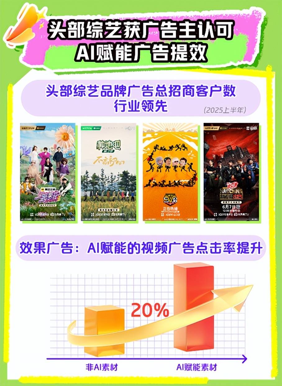 头部内容继续吸引广告主投放。2025年上半年,爱奇艺头部综艺品牌广告总招商客户数和平均招商客户数达行业领先。其中,综N代在拓宽广告收入上潜力巨大,《喜剧之王单口季》第二季广告收入较前作翻倍。未来,爱奇艺将更重视提升头部综艺、大剧、剧场厂牌的广告售卖,同时积极开拓微短内容及定制项目的广告收入新机会。此外,不断提升TV大屏端的商业化能力,通过创新广告产品扩展广告库存。在效果广告方面,爱奇艺利用AI优化广告素材和投放策略,本季度AI赋能的视频广告点击率比非AI素材提升20%。