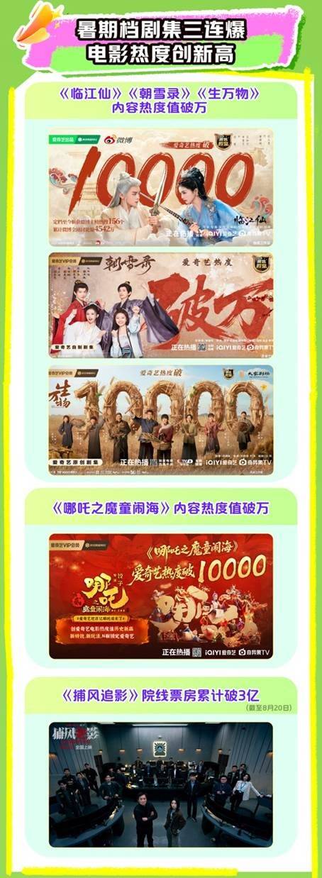 进入暑期,爱奇艺每周推出2~3部头部微剧,《若熙传》《天若有情》已接连上线。综艺《喜剧之王单口季》第二季云合市占率位列暑期档同品类行业第一。电影精彩不断 ,截至8月20日爱奇艺出品电影《捕风追影》院线票房累计破3亿元;《哪吒之魔童闹海》上线播出继续火爆,成为爱奇艺首部内容热度值破万的电影,和自制网络电影《终极拯救》《缉盗》一起持续丰富用户暑期娱乐选择。