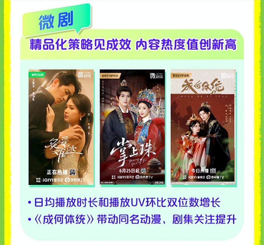 爱奇艺目前已储备约1.5万部竖屏微剧,构建了规模化的内容库,同时发力精品微剧,通过“自制+采购”形成稳定的头部内容供给,第二季度推出《炙爱难逃》《成何体统》和《掌上珠》等多部深受用户欢迎的精品自制微剧。爱奇艺首部由动漫IP改编的微剧《成何体统》内容热度峰值破5500,刷新平台微剧内容热度值纪录,首周的日均播放UV和会员拉新收入均超年初爆款《家里家外》同期表现。值得一提的是,《成何体统》的热播显著提升了同名动漫第一季的复看量,带动了同名长剧和动漫第二季预约量增长3倍。