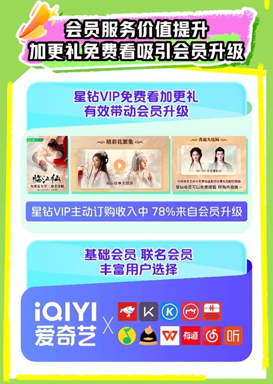 第二季度,加更礼免费看权益有效提升了星钻会员价值感知和订阅吸引力,星钻VIP主动订购收入中 78%来自会员升级。目前,爱奇艺推出了超10款联名会员,并与含广告基础会员一起丰富用户选择。此外,爱奇艺还通过加更礼赠好友功能、上线积分兑换频道及12场高等级VIP会员线下活动等举措,进一步提升了会员权益的吸引力。
