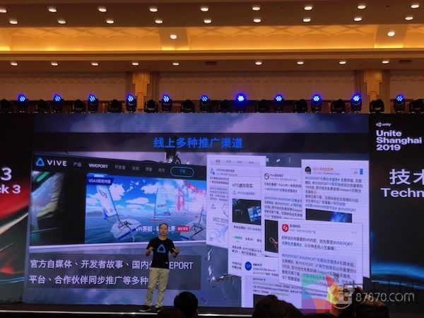 HTC Viveport中国区负责人谢礼安在现场宣布了与Unity达成的合作,帮助开发者更方便的将内容上传至Viveport进行分发,也详细介绍了Viveport提供的内容和服务。同时还由HTC负责开发者关系和内容的袁东,向开发者介绍了关于Vive最新SDK的详细内容。