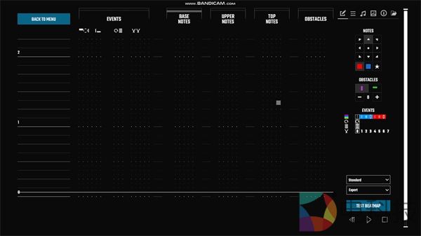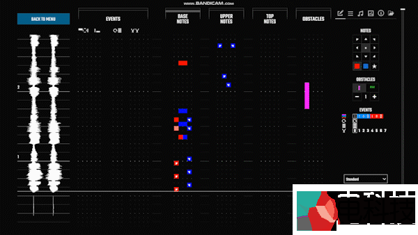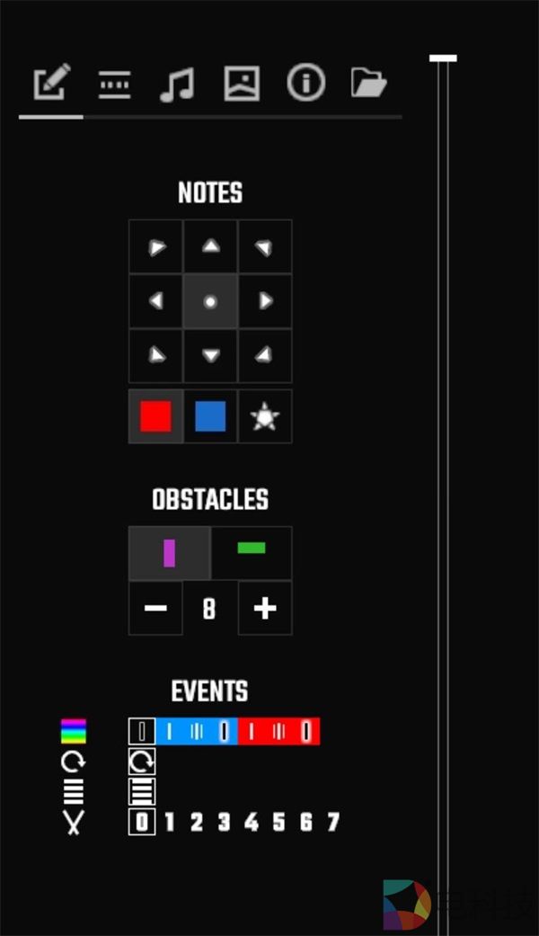 音符的部分了红、蓝和炸弹三个类型,其中红、蓝音符又分别有9个不同的方向。而障碍物的设置则以拍子为准,分别是1、2、4、8、16。其下就是一些光效的添加。