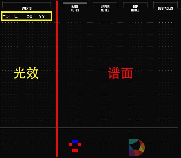 编辑区又被分为了两个大的部分。可以看到,它以音符出现的位置分为了基础、上部和顶部以及障碍物四个轨道。这很好理解。而左边就比较神奇,是调整游戏中光效变化的轨道。并且也被一些具有代表性的符号做了分类。