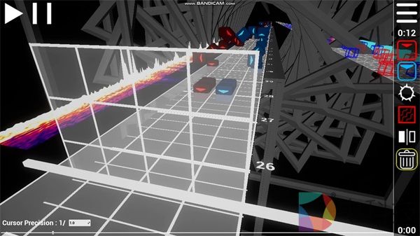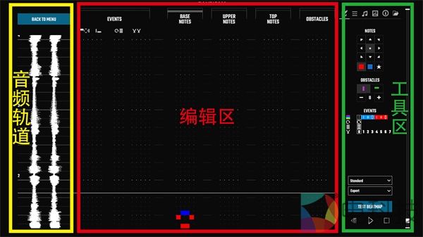 整体看,关卡编辑器一共有三个大的功能分区,左边为音频轨道,可以让你清楚地看到音乐的波纹,可视化的作用自然是方便卡点。中间一部分是编辑区,可以在这里设计你脑海中的谱面。右边是工具区,选择你需要的音符和其他效果,一些设置和导入选项也被放在了这一部分里。