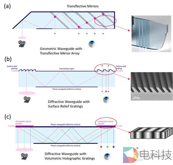 图 4. 光波导的种类: (a) 几何式光波导和“半透半反”镜面阵列的原理示意图, (b) 衍射式光波导和表面浮雕光栅的原理示意图, (c) 衍射式光波导和全息体光栅的原理示意图。