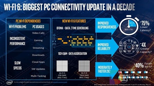 Wi-Fi 6也是Ice Lake平台新支持的Wi-Fi标准,速度更快、延迟更低,容量更大,支持160MHz通道和OBSS网络噪音过滤,可以提升无线网络速度并增强网络可靠性,改进密集环境中的网络性能。