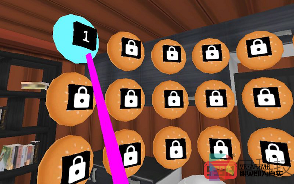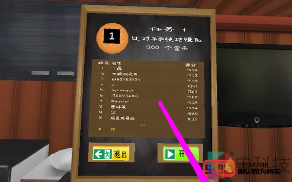 看完了教程,选择任务(也就是单人模式),在这里我看到一大堆关卡在等着我。游戏采用类似《愤怒的小鸟》的模式,玩家需要在每一个关卡中完成相应的任务,然后才能解锁后面的关卡。这种多关卡多任务的方式非常适合移动VR游戏,原因也很简单,每一个关卡的内容加载量不大,便于一体机设备顺畅运行。在这款游戏中,每一个关卡的任务不仅在开头明确显示出来,而且还显示了玩家得分排行榜,这样的设计显然是鼓励不同玩家之间的竞争,喜欢拿高分的玩家肯定十分喜欢。