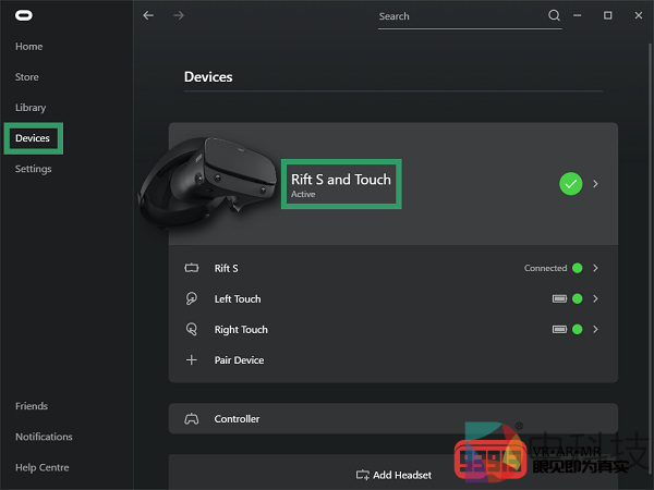 要查找Rift S的分辨率设置,请打开Oculus应用程序,单击“设备”,然后单击“Rift S and Touch”: