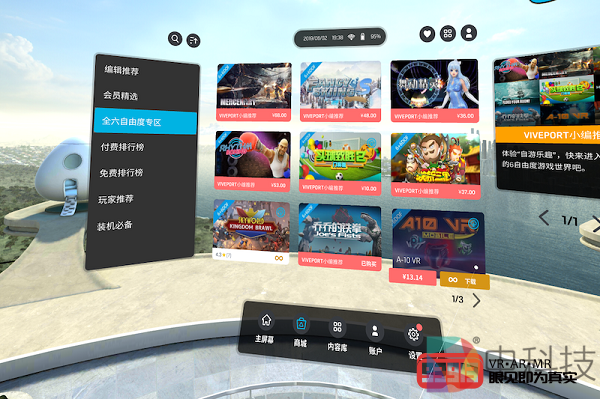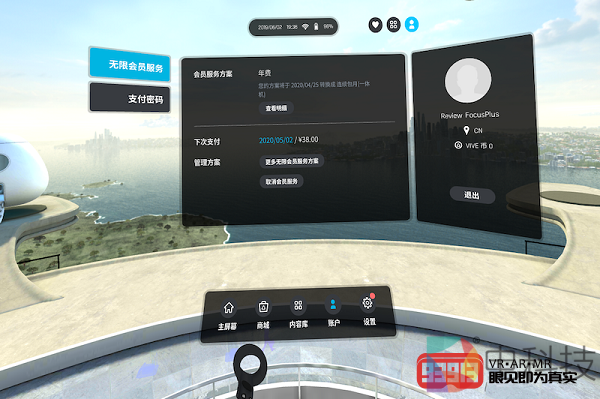 通过主屏幕顶部、底部及右侧的图标,我们都可以跳转到账号界面。在这里我们可以查看当前用户的具体信息,特别是有关VIVEPORT无限会员服务的信息。这里再简单介绍一下VIVEPORT无限会员服务,目前该服务包括两种模式:一种是面向PCVR及VR一体机用户,用户仅需月付58元或年付480元,便可畅享600多款PCVR和70多款一体机付费内容;另一种则只面向VR一体机用户,凡使用搭载VIVE WAVE平台的一体机用户均可以38元每月的价格无限下载及体验会员专区的所有一体机内容。