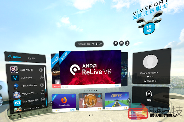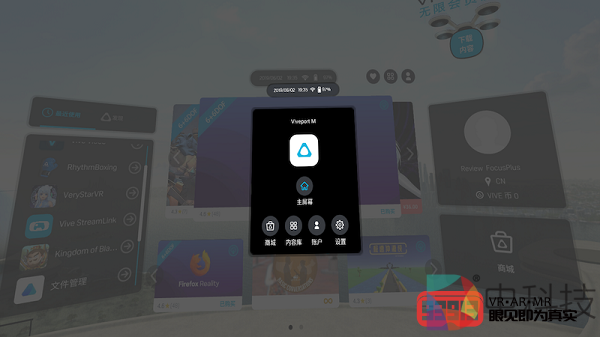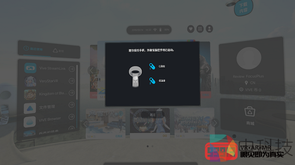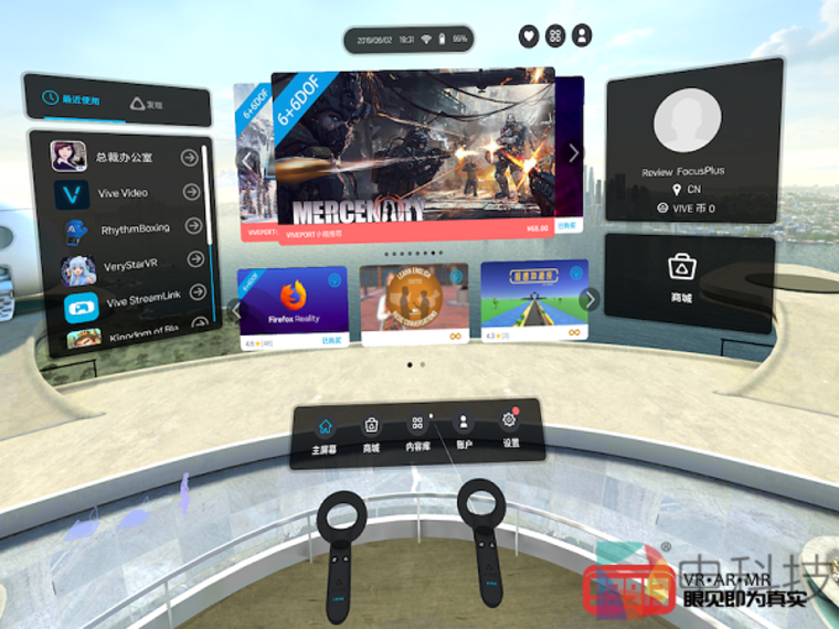 经过系统提示,我长按两个手柄上的VIVE键完成了系统识别,然后进入到VIVE Focus Plus的世界(主屏幕)。主屏幕的界面设计非常简洁,令人一目了然。画面中央区域显示官方推荐内容,其上方的信息框里显示了当前时间、网络连接及剩余电量信息,其下方的信息框里显示了“主屏幕”、“商城”、“内容库”、“账户”及“设置”这五大系统模块的图标。画面左侧的信息栏拥有“最近使用”及“发现”两个栏目,分别显示各自对应的内容/应用信息,画面右侧则是账户及商城的大图标,点击即可进入相关界面。