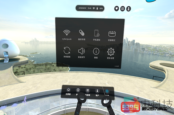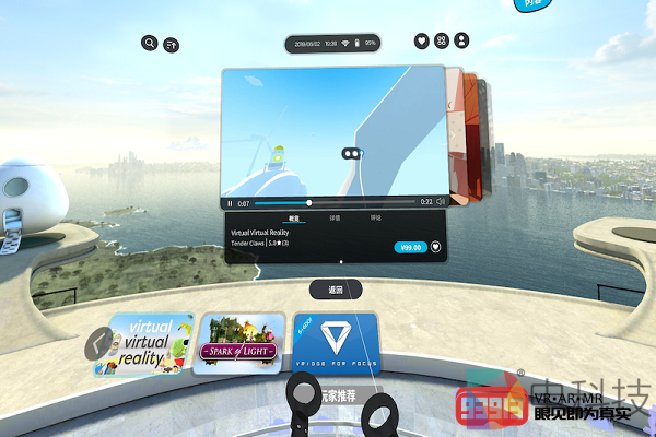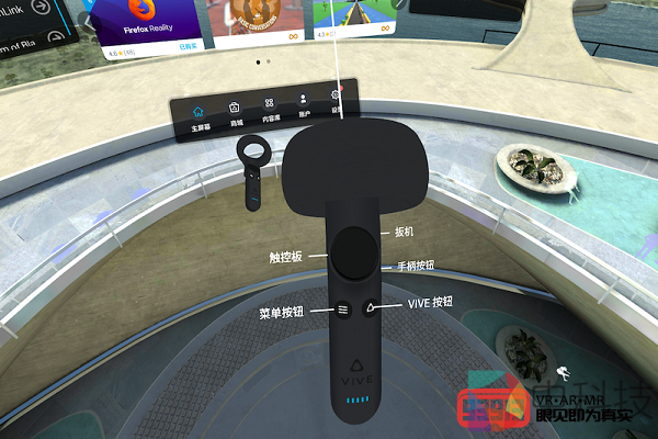 这里我需要特别提一下手柄,当我将手中的两个手柄拉近,可以看到手柄上的键位信息显示出来,这点对于新手用户来说非常友善。而当我按下VIVE键,系统会弹出一个菜单,让用户进行选择。与其他一体机产品只提供了一个点击就返回主屏幕的键位不同,VIVE键可以让用户随时随地的直接跳转到最常用的几个界面,这点在设计上也确实值得称道。