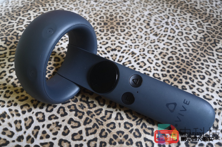 简单观察完头显,下面我们来看看手柄。此次VIVE Focus Plus提供了两个支持6DoF交互的手柄,而我个人对其设计非常满意。手柄顶部的环状部分分布了数个传感器,在手柄正面依次分布有触控板(圆盘键)、菜单键和VIVE键(其具体功能稍后介绍),在手柄背面设置了扳机键和手柄按钮(其实就是第二个扳机键)。看得出来,VIVE Focus Plus的手柄键位做到了与VIVE手柄一一对应,只不过在具体位置有所调整。具体来说,VIVE手柄正面的触控板(圆盘键)、菜单键和VIVE键均在VIVE Focus Plus手柄得以体现,只不过菜单键和VIVE键此次并排放在了触控板下方;VIVE手柄的扳机键与VIVE Focus Plus手柄的扳机键对应,而VIVE手柄的侧键则变成了VIVE Focus Plus手柄的第二个扳机键(手柄按钮),并且针对中指的位置调整了外形设计,这点确实很贴心。简单来说,VIVE Focus Plus的手柄可以看做是VIVE手柄的缩小版,而且在手感上更有所提升。