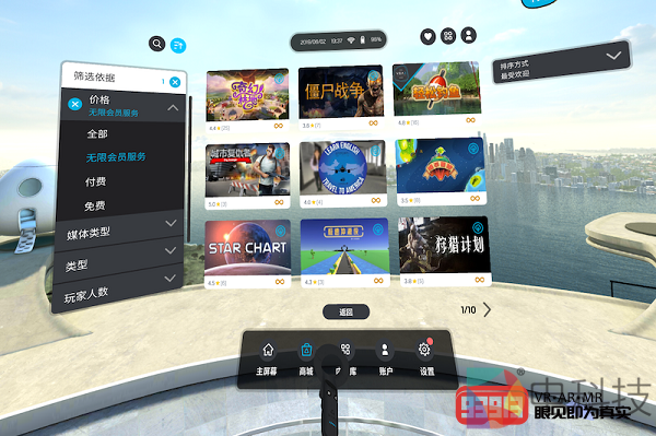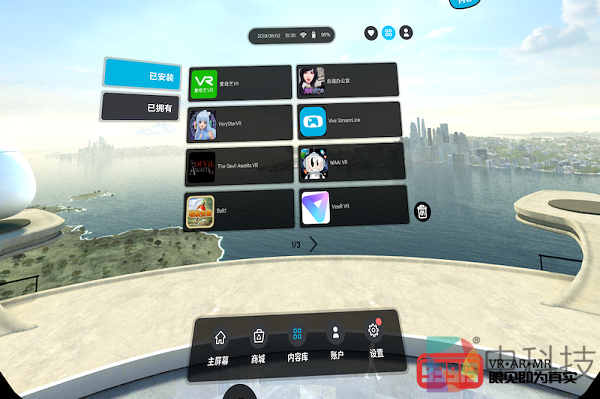 返回主屏幕,我进入了另一个主要模块——内容库。这里显示了当前用户已安装以及已拥有(已购买但未下载)的内容/应用。除了几款对应6DoF交互的VR游戏,我还发现了几款3DoF VR游戏,至于其具体表现如何,我会在后面的内容体验篇进行介绍。