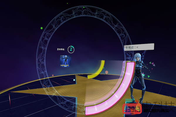 我体验的第三款游戏《舞动精灵》之前的版本主要针对3DoF VR一体机,是一款单手柄操作的音乐节奏游戏。登录VIVE Focus Plus的全新版本支持双手操作,在玩法上类似现象级大作《Beat Saber》。在我的面前有一个光圈,而我需要挥舞手中的光剑(也是光剑),在不同的弧形光标到达光圈时一一将其击中。在我眼中,《舞动精灵》是目前少有的在爽快感上可以媲美《Beat Saber》的VR音游,而此次在VIVE Focus Plus上的表现同样令人满意。