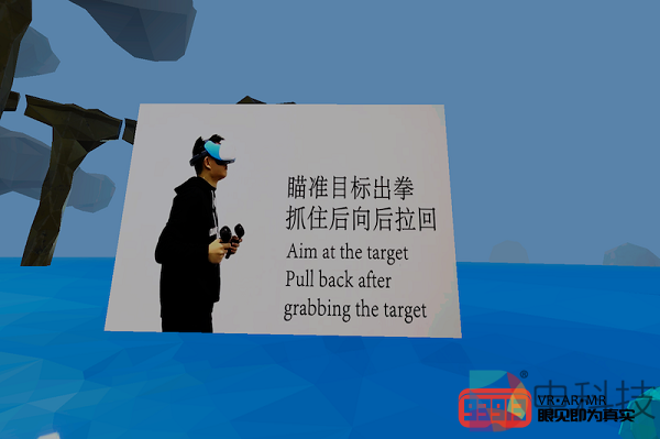 简单体验完系统界面之后,真正的重头戏来了。接下来我就来体验在VIVE Focus Plus玩游戏和看视频的感觉。我选择的第一款游戏名为《乔乔的铁拳》,从体量上看这是一款小品级游戏,不过从游戏中主视角左侧的说明画面来看,我怀疑这款游戏应该是对VIVE Focus Plus进行了深度定制。