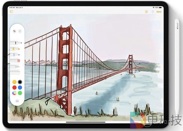 Apple Pencil也进行了改进,延迟从20ms减少到9ms,功能面板按钮布局也有变化,现在可以放置在屏幕的某一边或某一个角落。Apple Pencil还加入了新的操作,直接从屏幕角落向中心滑动就能触发屏幕截屏与编辑功能,用户可以自由滑动需要截取的屏幕区域并进行编辑。
