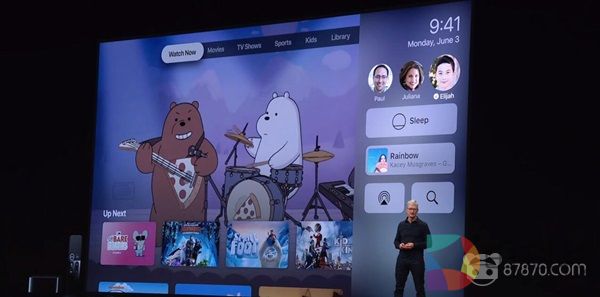 接下来是tvOS的更新内容。本次tvOS更新中最重要的新特性是对多用户的支持,Apple TV会根据不同的用户来推荐不同的节目内容。Apple Music也能同样享受这一新特性的支持,同时还增加了在屏幕上显示歌词的功能。