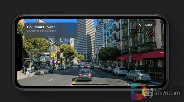 此外新加入的Look Around实景功能让你可以查看目标地点的360度高清全景图片,并可以点击图片中的街道进行移动。从现场演示效果来看,无论是照片清晰度还是用户视角移动时的效果都非常棒。