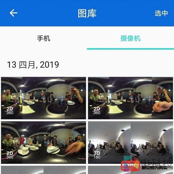 返回主界面,在主界面选择“图库”图标,进入图库界面,在这里我们可以查看手机及摄像机里面的拍摄内容。选择界面右上角的“选中”图标,即可选择多个摄像机的图片及视频文件下载到手机。一般来说,当我们使用Vuze XR拍摄完图片或视频内容之后,一方面可以通过APP下载到手机,另一方面也可以将位于存储卡里的这些内容复制到电脑里进行查看。