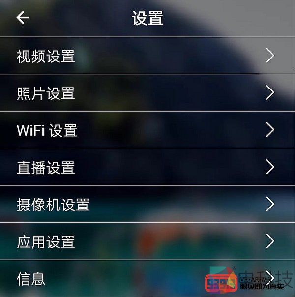 返回主界面,在主界面选择齿轮形状的图标,进入设置界面。在这里我们可以针对不同项目进行设置,比如之前我们提到的应用设置及摄像机设置。Vuze XR提供了多种拍摄、拼接、直播等方面的参数及选项,用户可以根据自己的需要进行详细的设置,这里就不一一赘述了。
