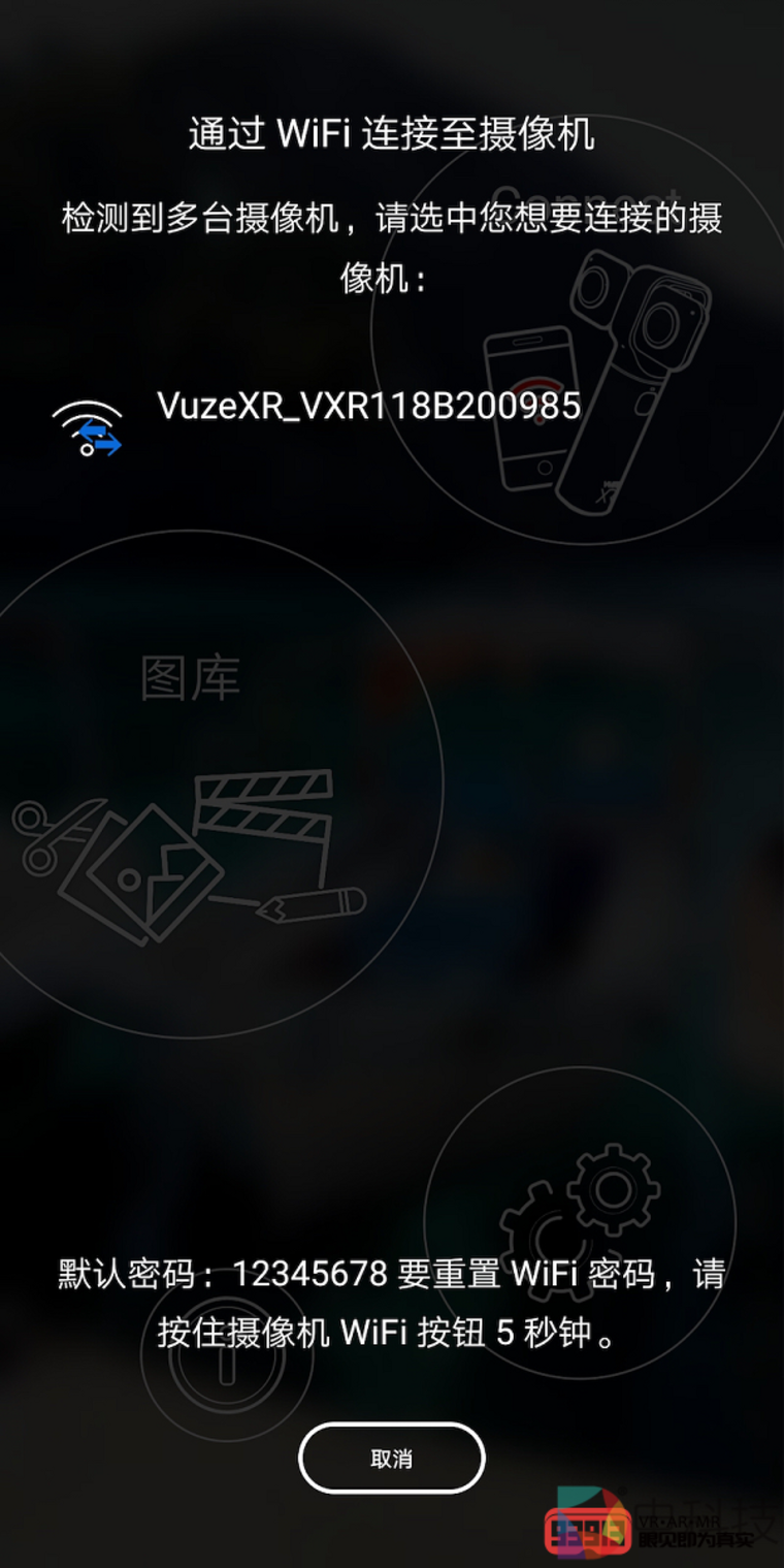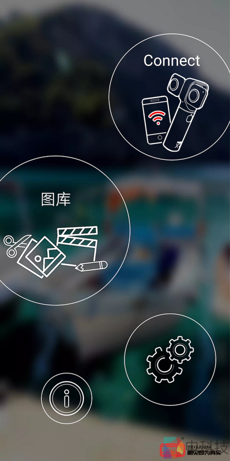 现在返回主界面,在主界面选择“Connect”图标连接摄像机。同时,长按Vuze XR摄像机的电源键进行开机,并在开机后短按WIFI键启动摄像机的WIFI功能。