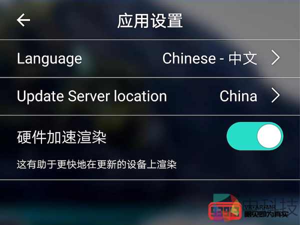 首先启动Vuze XR APP,在主界面选择齿轮形状的图标,进入设置界面,然后选择应用设置,进入应用设置界面。