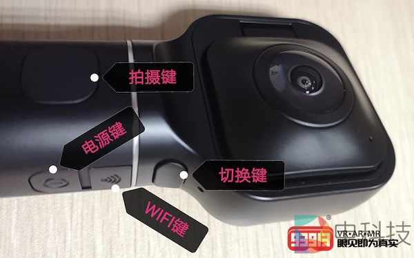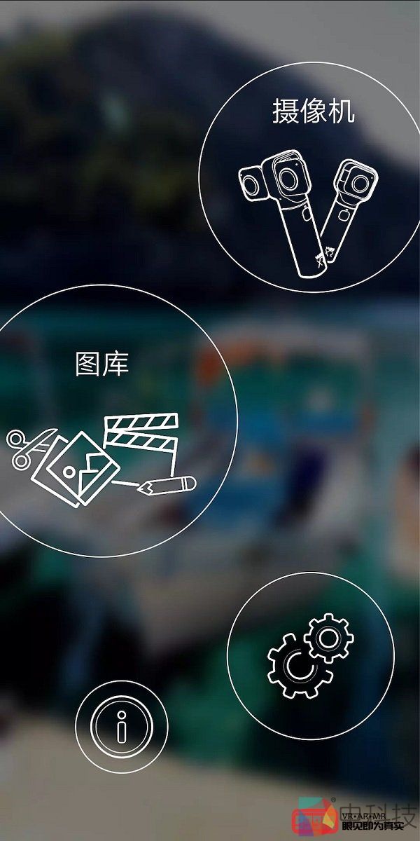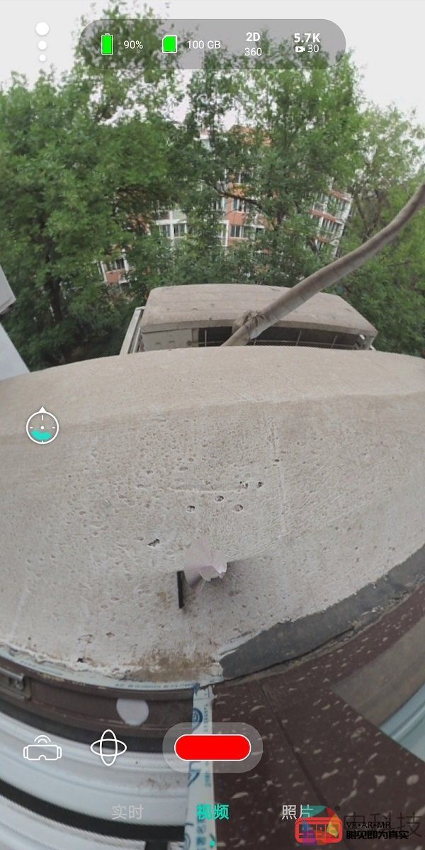 在摄像机界面,我们可以用APP控制Vuze XR摄像机的拍摄,此时画面显示摄像机的取景画面。这里需要注意的是,如果摄像机处于360全景模式则显示360度的取景画面,如果摄像机处于180 3D模式则显示180度的取景画面。画面顶部显示当前摄像机的剩余电量、可用空间、拍摄模式、像素和帧率。画面底部显示当前拍摄模式处于视频模式或照片模式,点击文字图标即可切换,点击其上的椭圆形按钮即可拍摄。