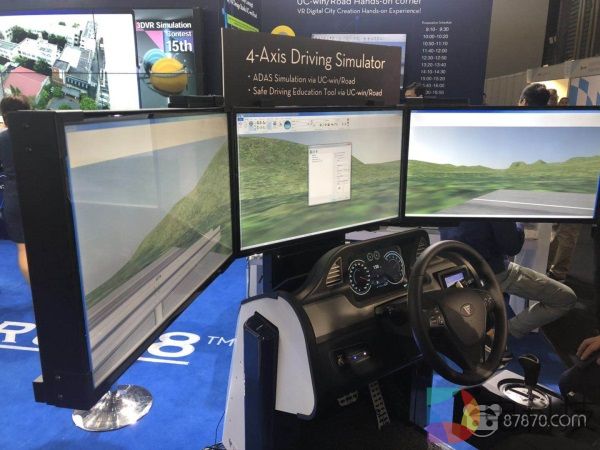 该系统由6DoF的座椅、模拟方向盘及挡位器加上三块屏幕构成,可以给体验者提供拟真的驾驶体验。其使用的虚拟驾驶场景可以由真实场景建模而成,并且能够在道路上模拟出车辆、障碍等多种不同的交通状况。87君试用了一下该系统,除了画面值得诟病,其他感受与驾驶真实车辆相差并不大。