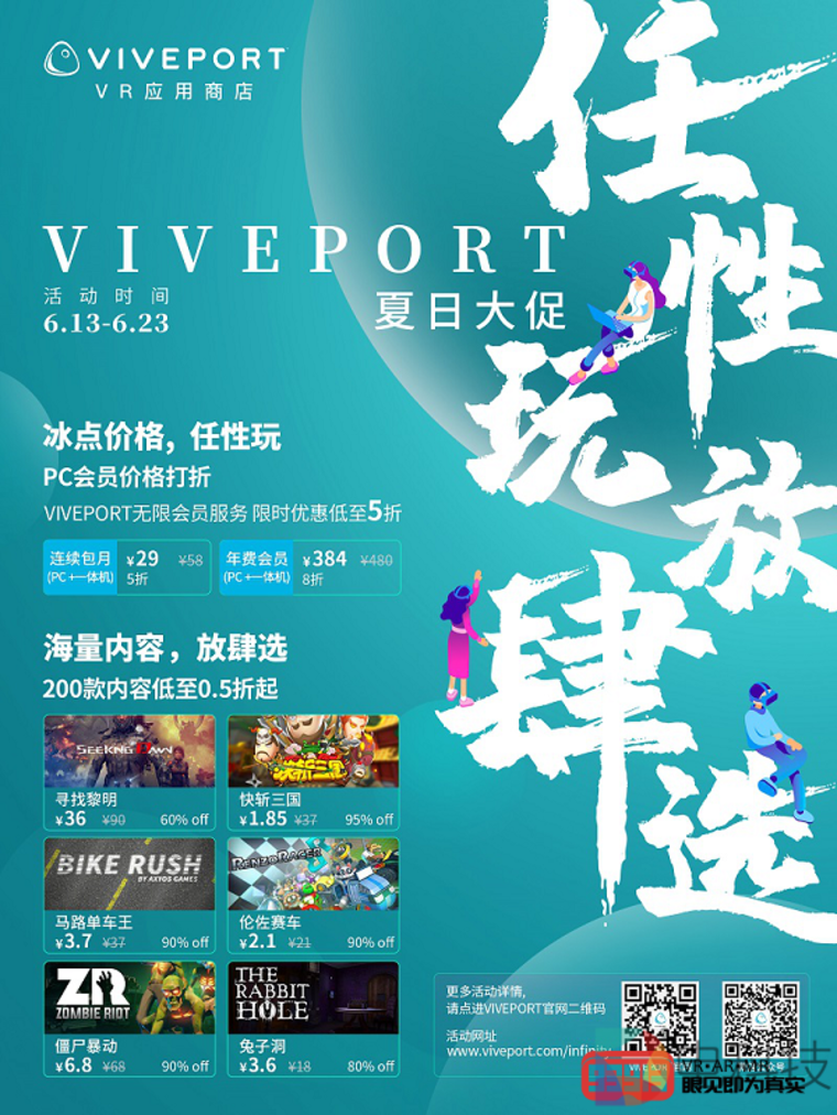6月13日,VIVEPORT夏日促销正式开启。活动期间(6月13-23日),VIVEPORT无限会员服务费用低至5折(连续包月5折29元,年费会员8折384元),200款内容低至0.5折起。我相信,力度如