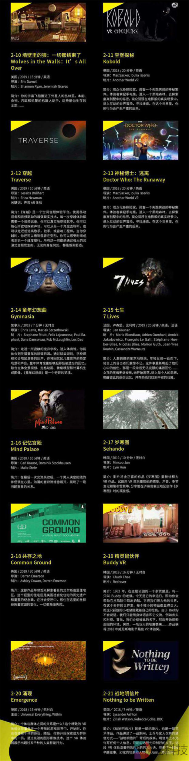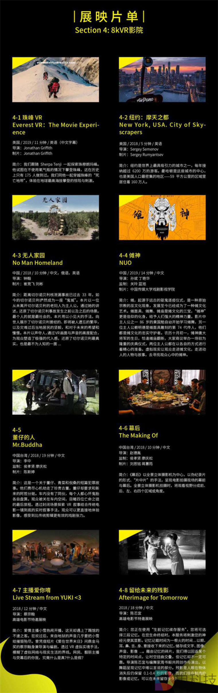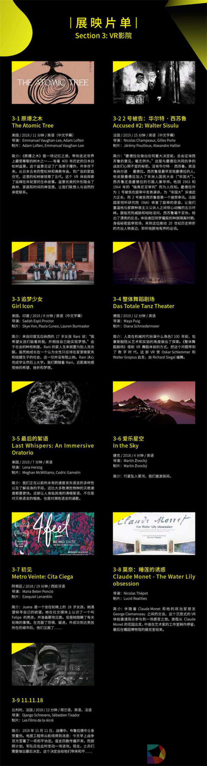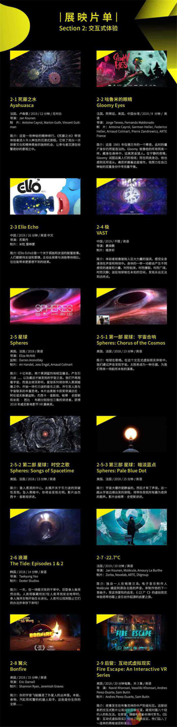 本次片单分为四大板块,大空间装置单元带领观众“实地”还原,走进作品;交互式体验单元强调交互,让观众自身成为剧情推动者;VR影院单元实现360度代入全景,为观众提供影院式集体观影体验;搭配了最新摄影技术和头显技术的8k影院单元,则为观众呈现极高清晰度的视觉盛宴。