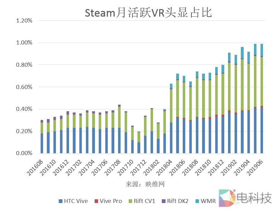 Valve今天公布了2019年6月的“Steam硬件和软件调查”数据,其中Oculus Rift在头显份额占比方面出现了一定的下滑,而WMR的份额占比则重新恢复了上涨趋势,并且在头显份额和月活跃占比方面双双创下了新高。