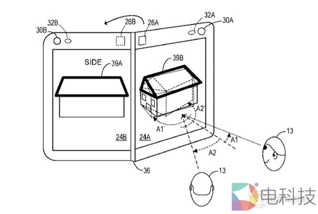 专利描述了一种合页式多屏计算设备,其包括壳体,壳体具有通过合页连接的第一部分和第二部分,每个部分包括显示器;安装在壳体中并配置成检测第一部分和第二部分之间铰接角的传感器,以及处理器。处理器配置为在第一显示器渲染和显示虚拟对象的三维表示,其中虚拟对象的三维视图渲染基于检测到的铰接角。