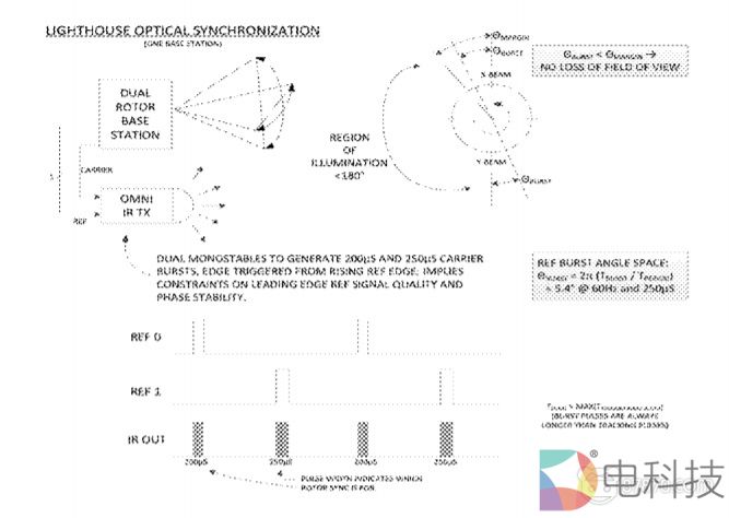 专利描述了应用于虚拟现实/增强现实的光学定位追踪系统。示例性系统包括一个或多个接收器和一个或多个发射器。示例性发射器包含两个正交转子,每个转子发射扇形激光光束。示例性光学接收器可以相对较小,并安装在VR显示器上。这种接收器由小型光学探测器组成,并可安装在头戴式VR显示器上。通过测量每个光束扫过每个接收器/检测器的时间,示例性系统可以确定具体的位置。