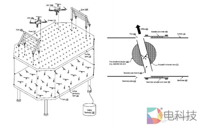 竞技场包括多孔表面,多孔表面输出气流,从而为无人机提供升力并将无人机推离多孔表面。气流同时可以提供推力并将无人机推向平行于多孔表面的方向。无人机可包括一个或多个螺旋桨,后者可向无人机提供升力,推力或两者。可以在一段持续时间内修改气流以改变对无人机的升力或推力。可以基于竞技场的区域来修改气流,从而修改竞技场不同区域中的升力或推力。无人机可以包括记录物体世界图像或视频的摄像头。在摄像头馈送呈现给显示器之前,可以对摄像头馈送进行修改,并形成一种增强现实视图。