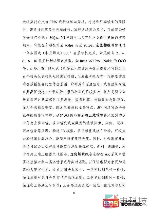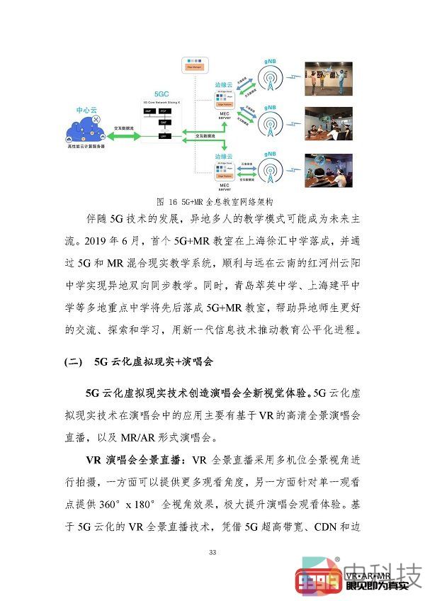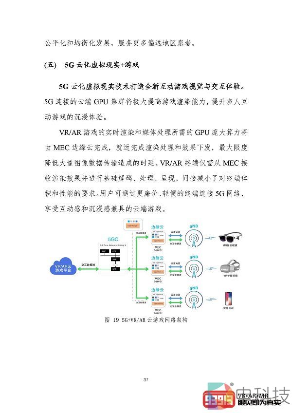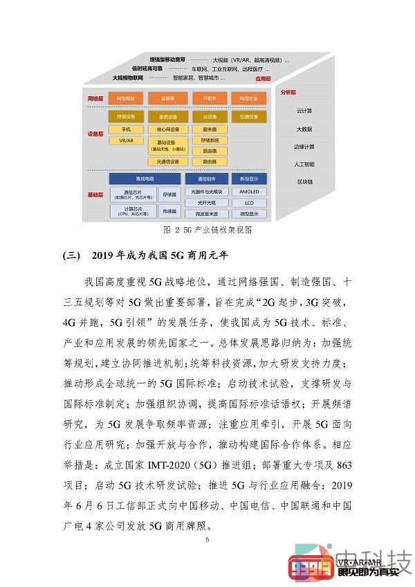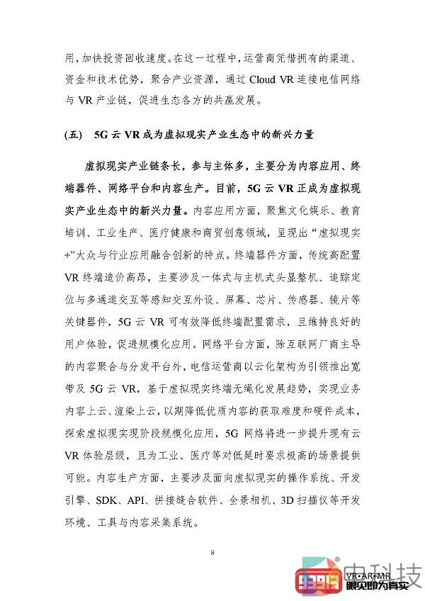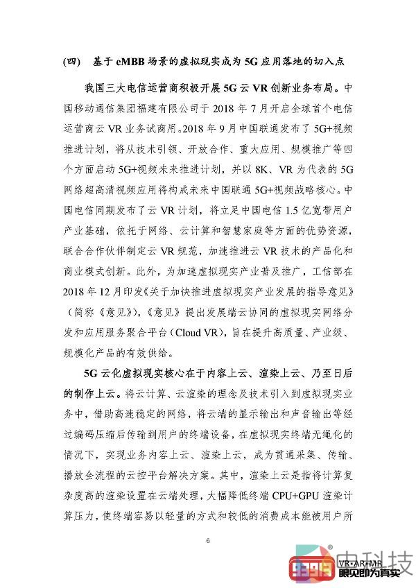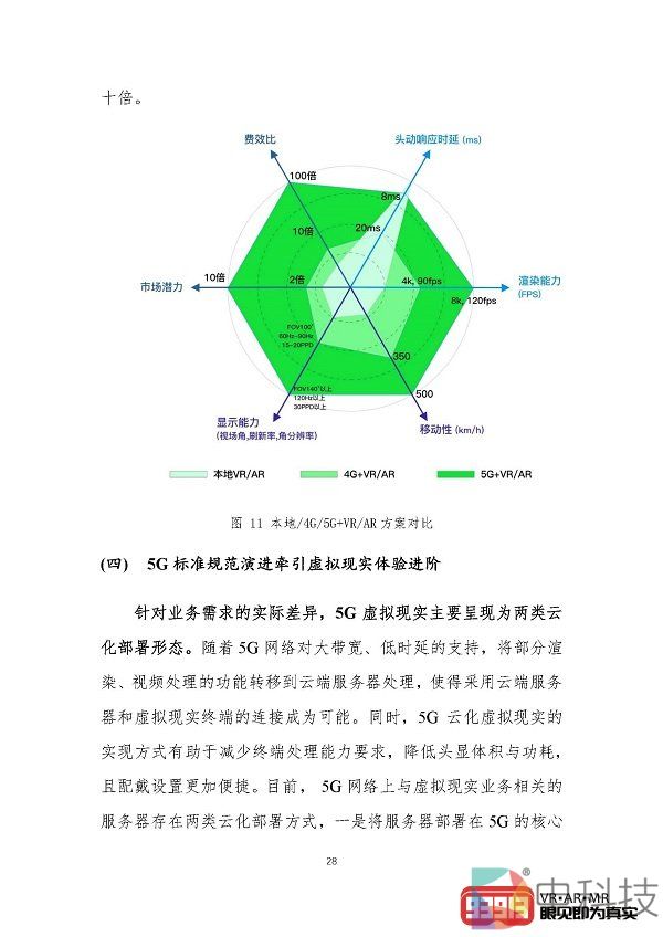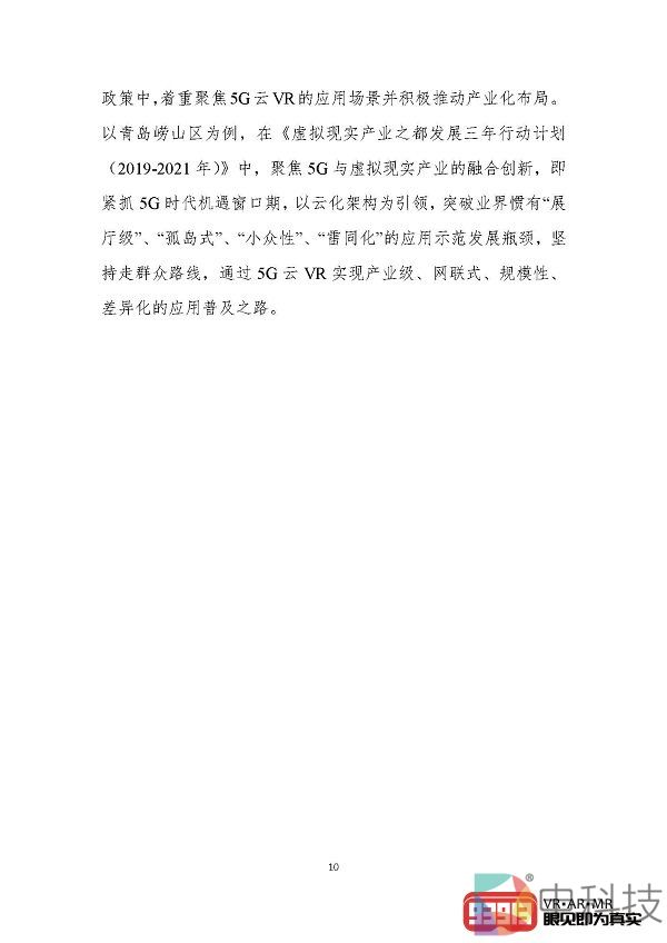 影创科技、诺基亚贝尔、信通院两化所与青岛市崂山区人民政府联合发布行业白皮书——《5G云化虚拟现实白皮书》。针对虚拟现实网联化发展趋势,结合近期5G商用正式开启契机,白皮书从效果、性能、经济性三个维度分析了5G对VR/AR/MR赋能情况,总结了5G+VR/AR/MR关键技术的产业成熟度,同时归纳了5G云化虚拟现实在教育、文娱、工业、医疗等领域的特色实践案例。白皮书倡导应牢牢把握住VR/AR/MR技术创新与5G带来产业变革的窗口期,发挥VR/AR/MR带动效应强的特点,以技术创新为支撑,以应用示范为突破,以产业融合为主线,丰富VR/AR/MR商业模式,整合VR/AR/MR产业链资源,构筑“5G云化虚拟现实”融通发展生态圈。