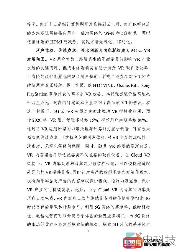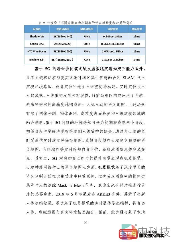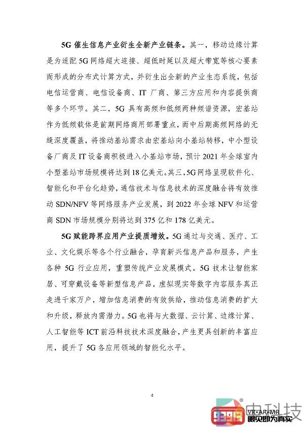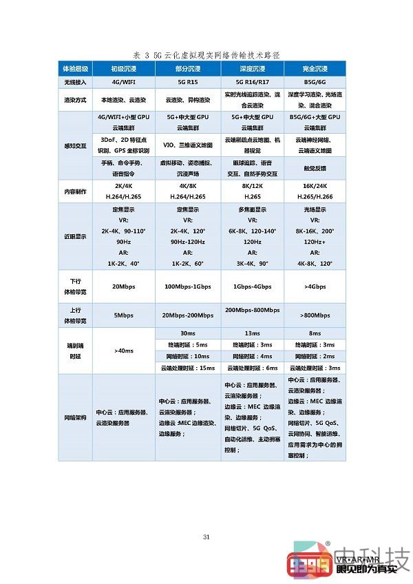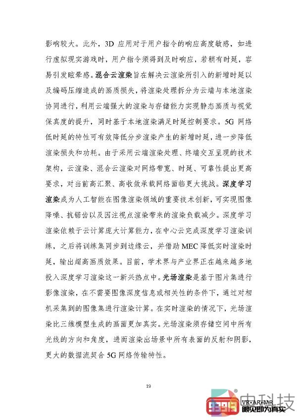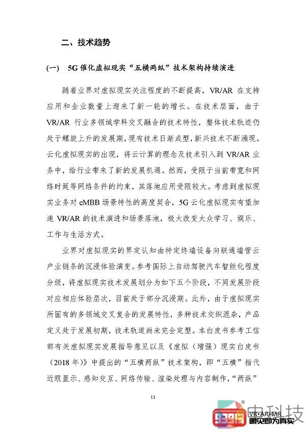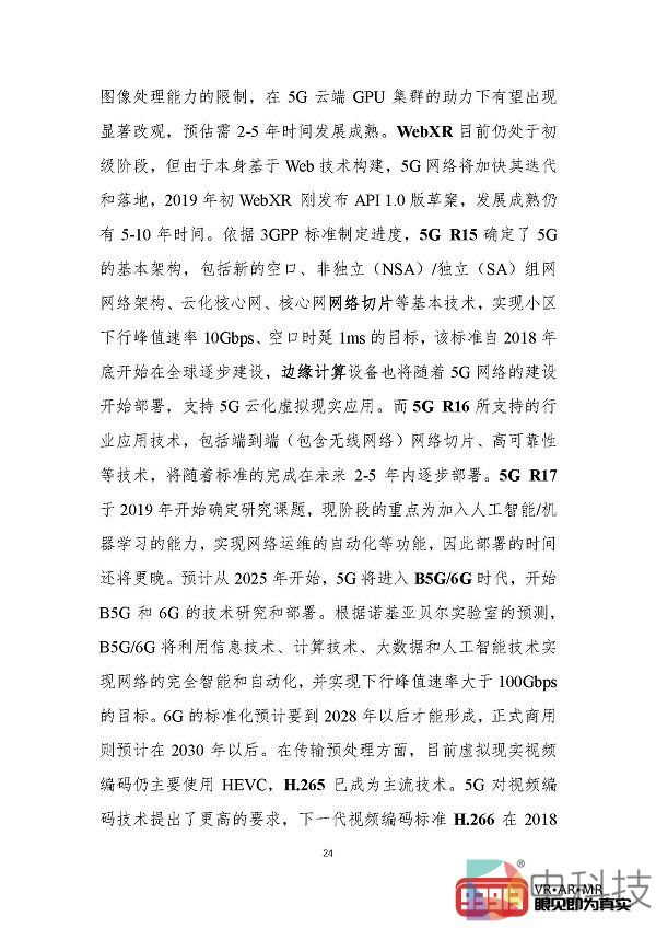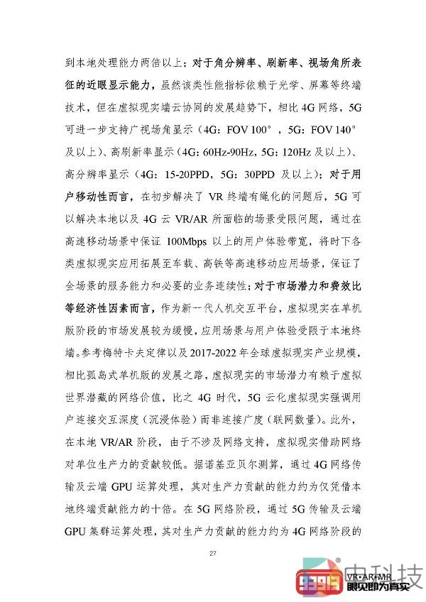 影创科技、诺基亚贝尔、信通院两化所与青岛市崂山区人民政府联合发布行业白皮书——《5G云化虚拟现实白皮书》。针对虚拟现实网联化发展趋势,结合近期5G商用正式开启契机,白皮书从效果、性能、经济性三个维度分析了5G对VR/AR/MR赋能情况,总结了5G+VR/AR/MR关键技术的产业成熟度,同时归纳了5G云化虚拟现实在教育、文娱、工业、医疗等领域的特色实践案例。白皮书倡导应牢牢把握住VR/AR/MR技术创新与5G带来产业变革的窗口期,发挥VR/AR/MR带动效应强的特点,以技术创新为支撑,以应用示范为突破,以产业融合为主线,丰富VR/AR/MR商业模式,整合VR/AR/MR产业链资源,构筑“5G云化虚拟现实”融通发展生态圈。