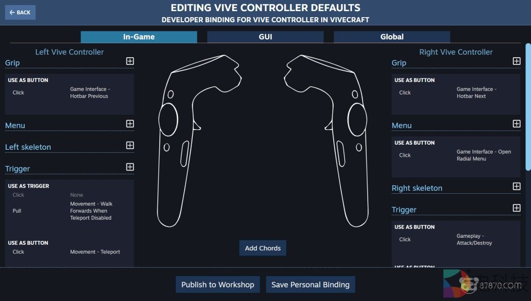 V社是于2018年正式放出了Steam Input,并允许游戏适配所有不同的VR控制器。这类似于Steam的常规控制器输入,对于熟悉Steam Controller的玩家来说应该不会感到陌生。SteamVR允许《Vivecraft》用户按照自己的喜好自定义控制器控键,这为Valve Index控制器提供了额外的灵活度。毕竟,与大多数控制设备不同,Index控制器搭载了87个传感器,包括用于输入的多个物理按钮和电容式触控板。