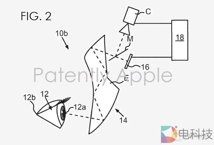 苹果专利图2是另一个实施例的示意图。在这个实施例中,光学元件14包括自由形状透镜E。从眼睛12传播至自由形状透镜E的光线被热镜M反射,然后再由捕获组件C捕获。