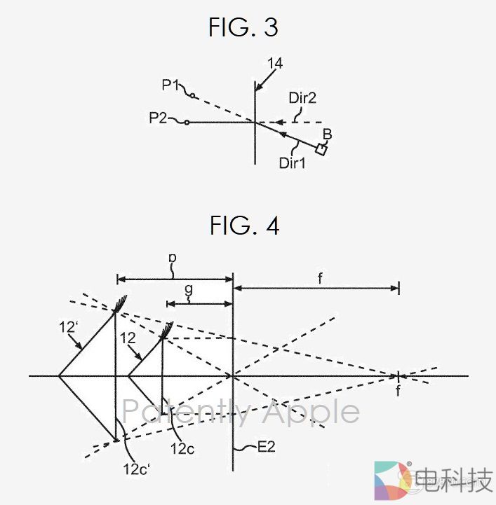 专利图3是光线追踪的一个示例图,其解释了光线追踪的原则可以用于头戴式眼动追踪设备10a和10b,尤其是考虑到光学元件14的光学特性。苹果构思的方法是,从捕获组件C开始追溯光线(在图3中用附图标记B表示),以检测到的特征的方向Dir1(由图3中用观察点P1表示)出发,直到它们到达光学元件14。然后,光线被折射,并且获得新的出射光线,折射光线用P2及其新方向Dir2进行描述。