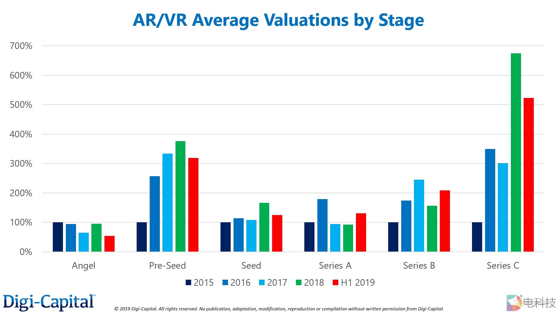 此外,Digi-Capital AR/VR平台也对AR/VR企业曾获得的数千次风投和企业融资进行分析,发现融资趋势的转变,似乎是早期融资平均估值下降的因素。