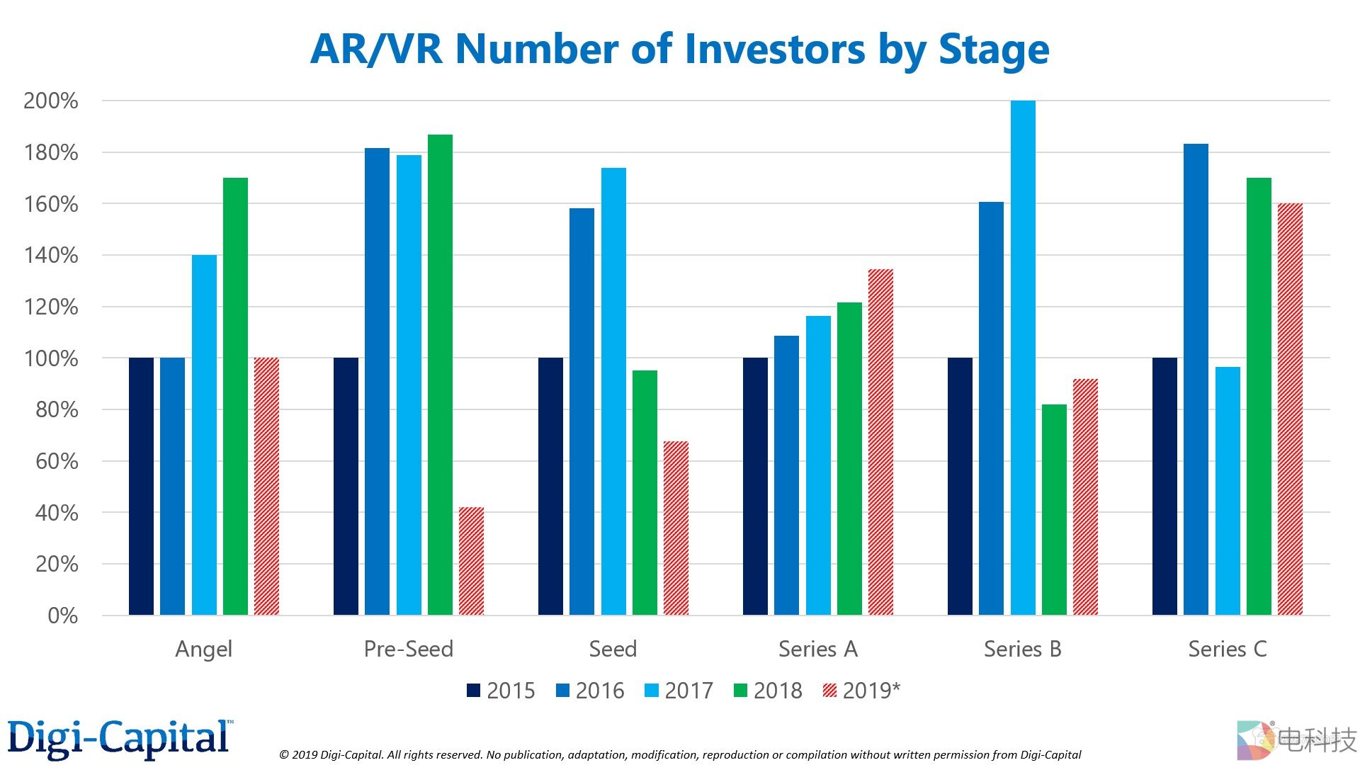 而AR/VR A轮融资则呈现不同趋势,投资者对这一轮融资的兴趣并未减弱,另外B轮投资者规模与去年相比下降不大,与2017年水平相当。C+轮方面,参与这一轮的投资者本身相对较少,目前数量稍有下滑,不过可能只是因为方差本身就比较高。