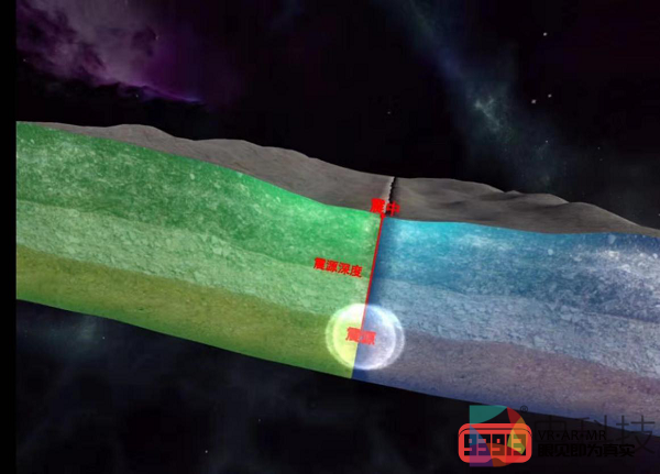 我们几个老师坐好之后,他们就把软件打开了,随即我们就戴上了VR眼镜。戴上眼镜的一刹那,我就眼前一亮,这画面也太清楚了吧,虽然我不太懂这清晰度是怎样来评判的,但他这个画面看着就是舒服。它模拟了地震形成的过程,通过动画和VR的方式,让我们更直观的看到地球的结构和地震形成的过程。