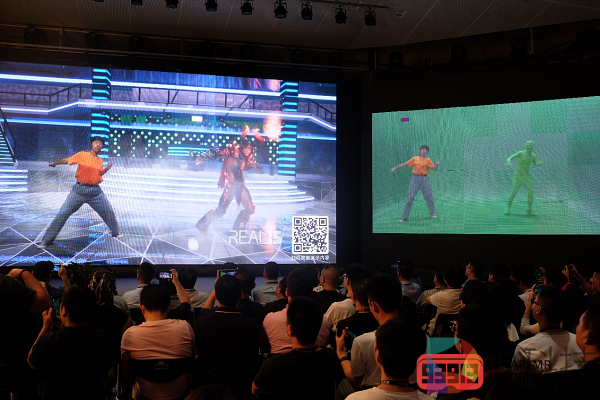 不仅是“牛魔王”,节目中还安排了另外一位“真实人物”与之互动。当两位舞者随意走位、交错运动的影像通过魔方系统实时投射到大屏幕时,观众们清晰地看到一个以假乱真的“虚拟事件”如何被“凭空”创造出来。此刻,现场弥漫的兴奋与惊叹的氛围令会议达到了高潮。