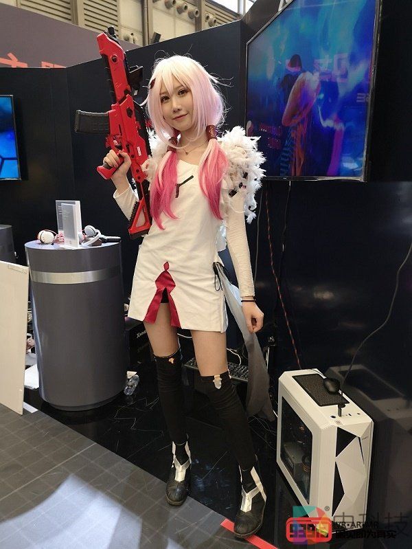就在这个区域内,我看到了一个持枪而立的萌妹子。妹子很萌,她的枪也很酷,原来是国产名牌PP Gun。一直以来,我个人对于红色的产品都很喜欢,而且这款枪械的设计实在不错,因此对于这把PP Gun我是钟爱有加,明天如果再有机会,我一定要好好体验一下在AR里进行枪战的感觉。